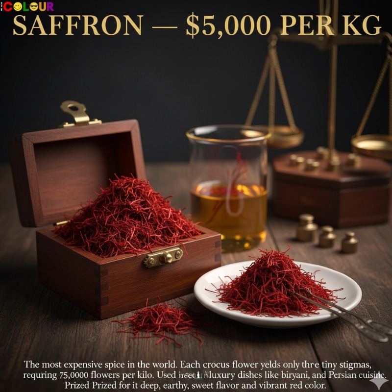 Saffron is the most expensive spice in the world. It comes from the tiny stigma of the saffron crocus flower. Each flower has only three stigmas, and it takes around 75,000 flowers to produce just one kilogram of saffron.