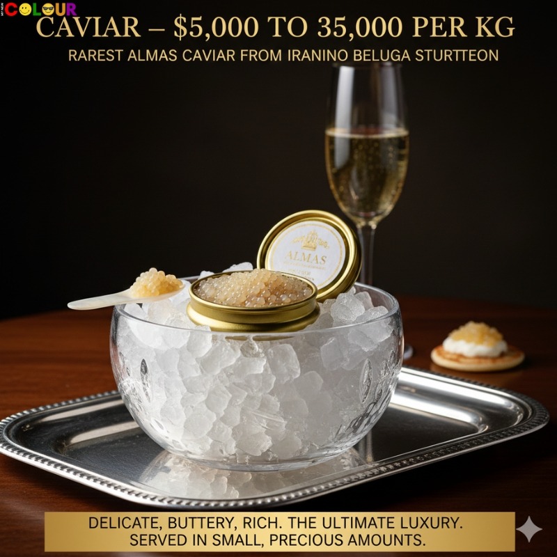 Caviar is the salt-cured eggs of sturgeon fish. The rarest type is Almas caviar, which can cost more than $35,000 per kilogram. It comes from the eggs of the very rare Iranian Albino Beluga sturgeon.